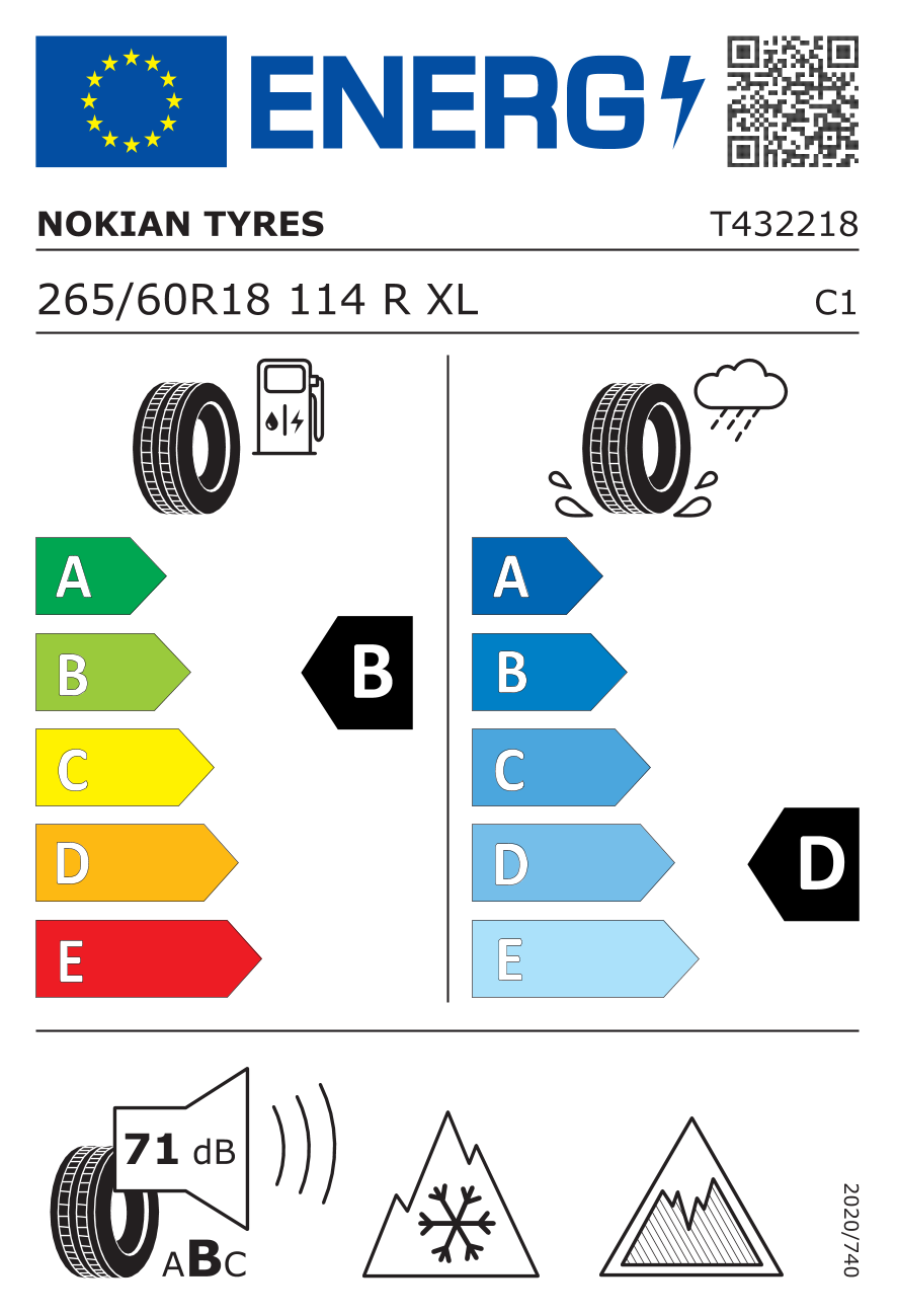 Prezentowana oferta sklepu internetowego opony.strefakierowcy.pl dotyczy opony marki Nokian. Jest to bieżnik Hakkapeliitta R5 SUV. Rozmiar tej opony to 265/60 R18. Maksymalna dopuszczalna prędkość użytkowania tej opony wynikająca z indeksu SI wynosi: R (do 170 km/h). Indeks nośności wynosi 114 co oznacza, że znosi obciążenie do 1180 kg na oponę. Kod opony to T432218, a kod EAN 6419440489988 - warto zapisać te wartości, aby w razie konieczności dokonania w przyszłości zakupu jednej sztuki opony móc precyzyjnie dobrać ten sam produkt. Klasa efektywności paliwowej, która przekłada się zużycie paliwa wynosi B. Przyczepność na mokrej nawierzchni określona została za pomocą europejskich norm na wartość D. Oczywiście w obu przypadkach A oznacza wynik optymalny. Jeśli chodzi o hałas zewnętrzny to opona generuje go 71 dB. Numer opony w bazie EPREL 511699. Dodatkowe oznaczenia występujące na tej oponie to: XL, Ice Grip.